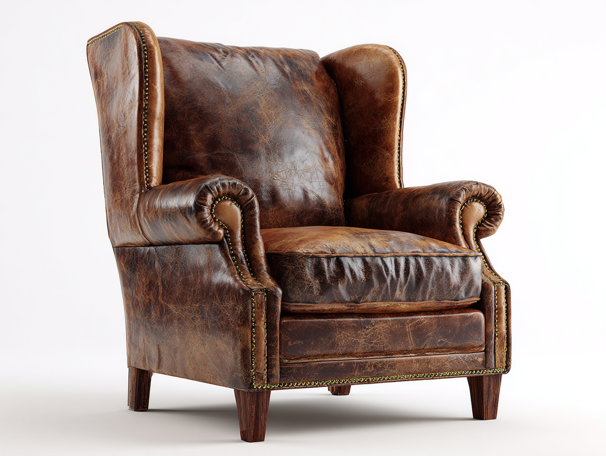 Der Sessel ist mit hochwertigem Kunstleder bezogen, das eine authentische Lederoptik bietet. Die stabile Innenkonstruktion gewährleistet eine zuverlässige Nutzung. Dekorative Nieten entlang der Armlehnen sowie die massiven Holzbeine unterstreichen die hochwertige Verarbeitung.