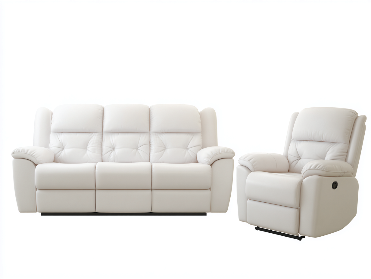 Dieses Relaxsofa Set in cremeweiß kombiniert modernes Design mit hohem Sitzkomfort. Die helle Farbgebung wirkt freundlich und passt zu verschiedenen Einrichtungsstilen, wodurch es sich ideal für den Einsatz im Wohnzimmer eignet.